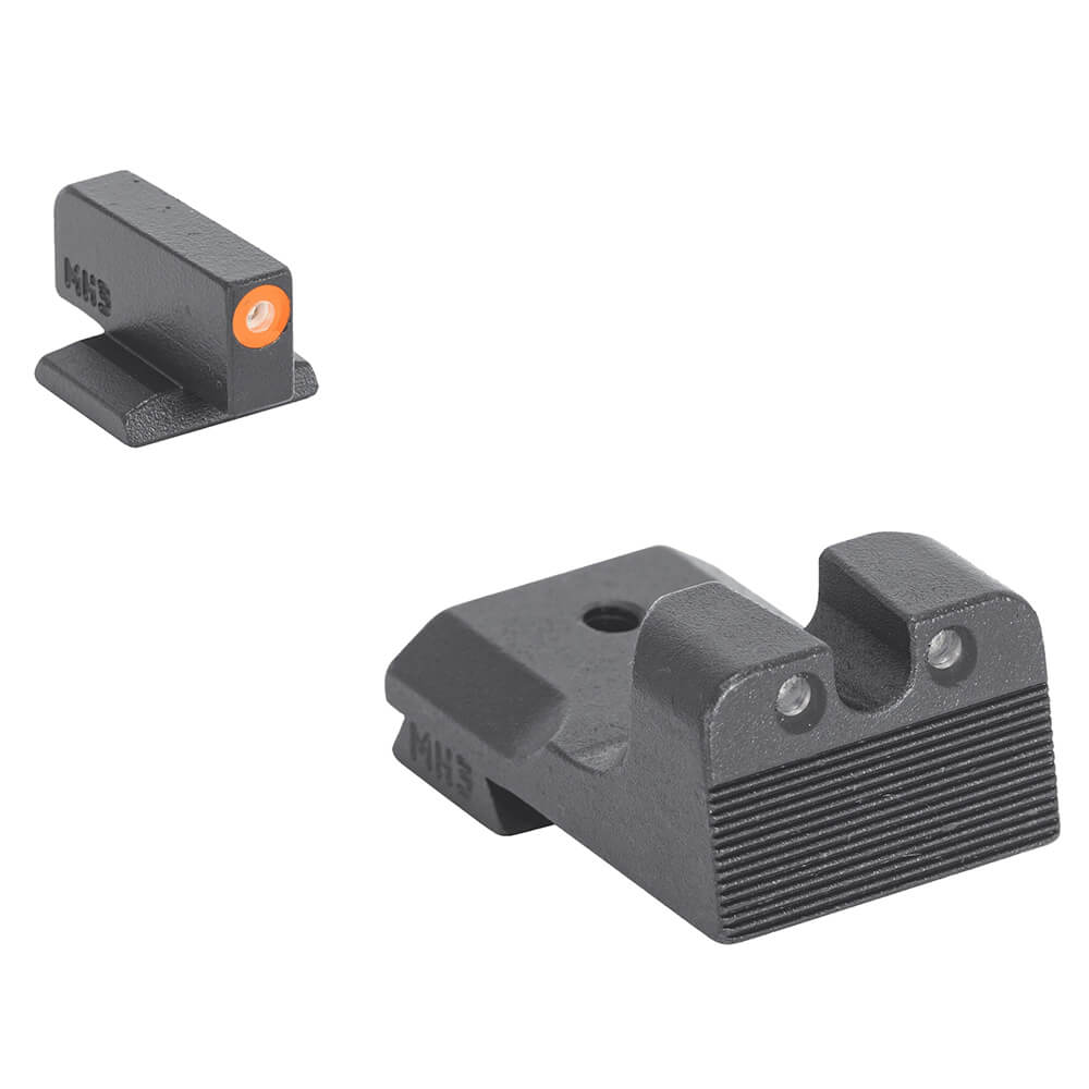 HYPER-BRIGHT CONCEPT: The MEPRO Hyper-Bright™ fixed Day and Night Sights offer the most reliable illumination for day or night. Mepro Hyper-Bright™ fixed sights feature an extremely bright fluorescent contrast colored ring in green or orange for fast target acquisition in the daytime. The yellow ring option is the sole option with phosphorescent paint that charges with light and glows in lowlight conditions for a short time in conjunction with the tritium. As a result, both rear and front tritium sources appear green in lowlight and nighttime.