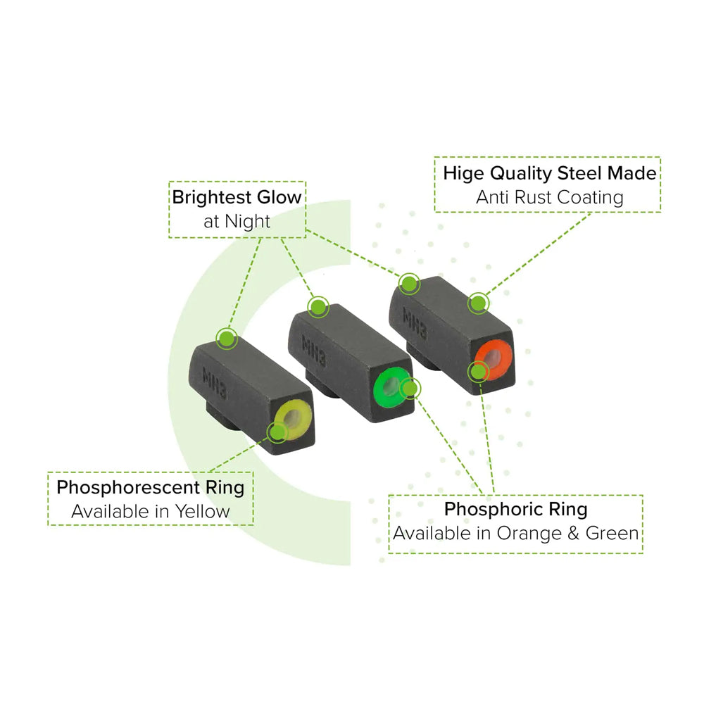 HYPER-BRIGHT CONCEPT: The MEPRO Hyper-Bright™ fixed Day and Night Sights offer the most reliable illumination for day or night. Mepro Hyper-Bright™ fixed sights feature an extremely bright fluorescent contrast colored ring in green or orange for fast target acquisition in the daytime. The yellow ring option is the sole option with phosphorescent paint that charges with light and glows in lowlight conditions for a short time in conjunction with the tritium. As a result, both rear and front tritium sources appear green in lowlight and nighttime.