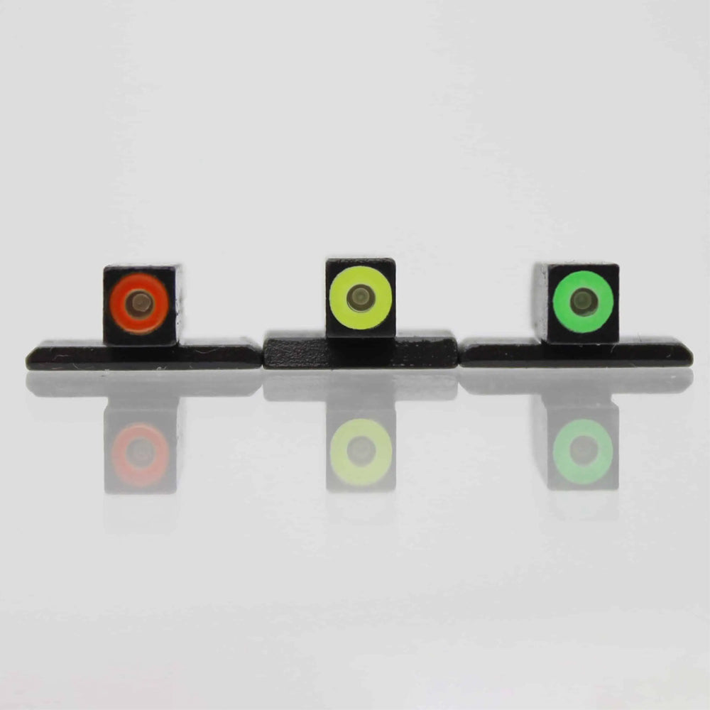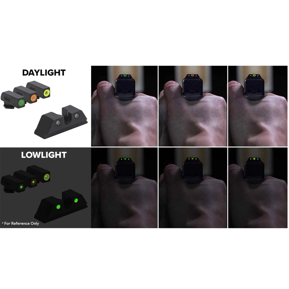 HYPER-BRIGHT CONCEPT: The MEPRO Hyper-Bright™ fixed Day and Night Sights offer the most reliable illumination for day or night. Mepro Hyper-Bright™ fixed sights feature an extremely bright fluorescent contrast colored ring in green or orange for fast target acquisition in the daytime. The yellow ring option is the sole option with phosphorescent paint that charges with light and glows in lowlight conditions for a short time in conjunction with the tritium. As a result, both rear and front tritium sources appear green in lowlight and nighttime.