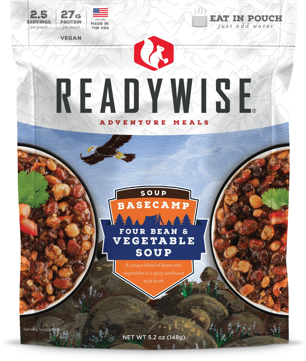 Each pouch of our Basecamp Four Bean & Vegetable Soup contains 2.5 servings and is resealable. These pouches are lightweight making them easily portable on any outdoor adventure. Just add water and you can eat directly from the pouch.