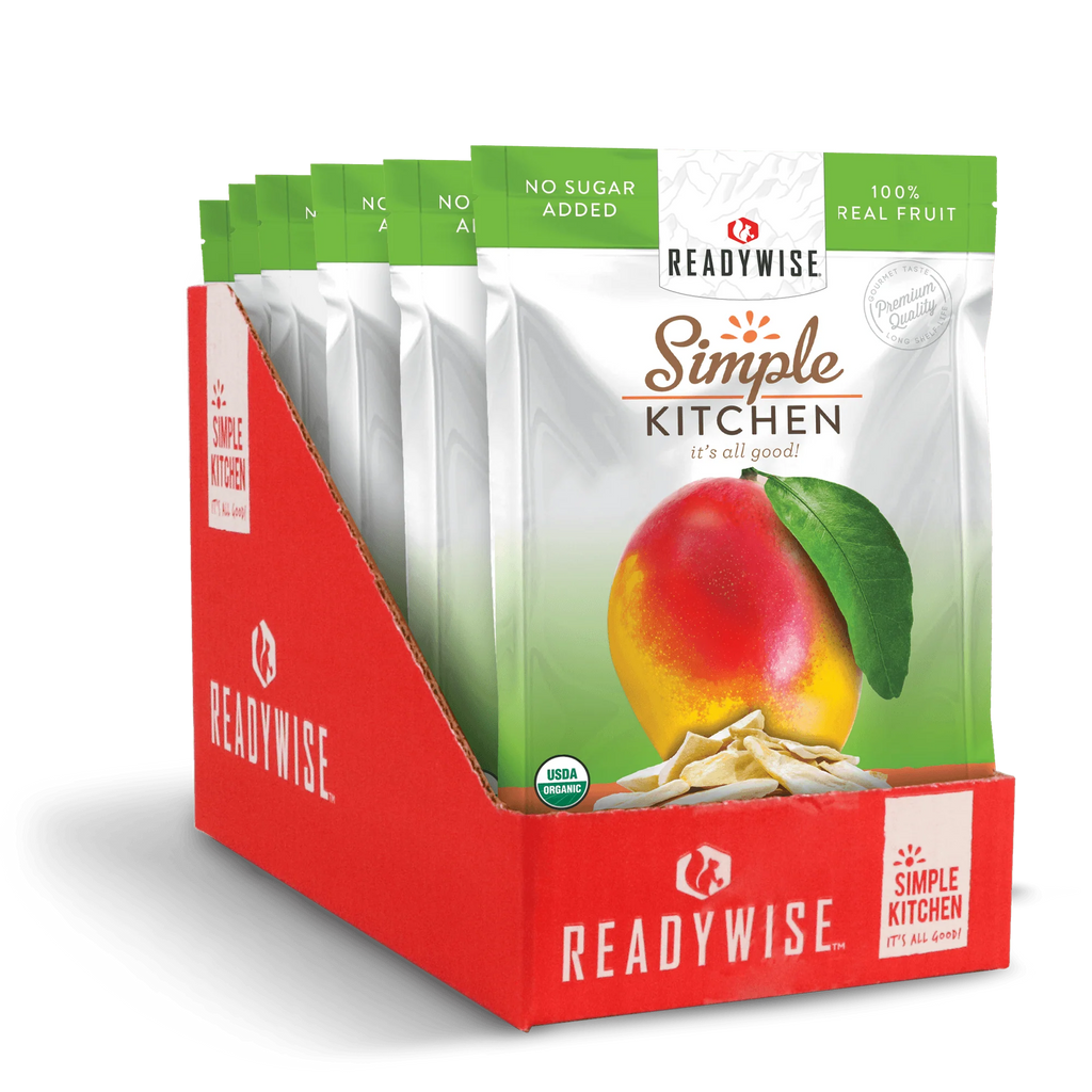This box includes six pouches of Simple Kitchen's (a ReadyWise Company brand) freeze-dried organic mangoes. No fake flavors or preservatives.