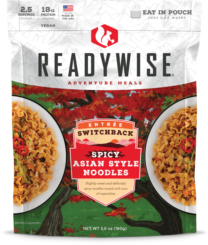 Each pouch of our Switchback Spicy Asian Style Noodles contains 2.5 servings and is resealable. These pouches are lightweight making them easily portable on any outdoor adventure. Just add water and you can eat directly from the pouch.