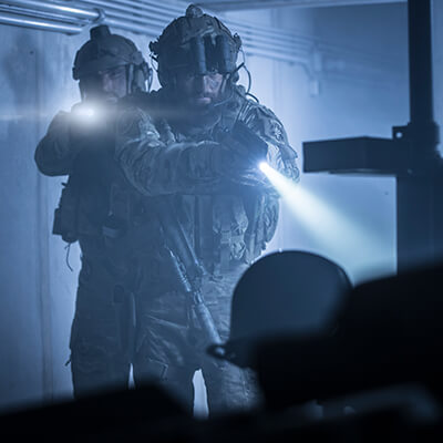 - Powered by two (2) 3-volt CR123A lithium batteries