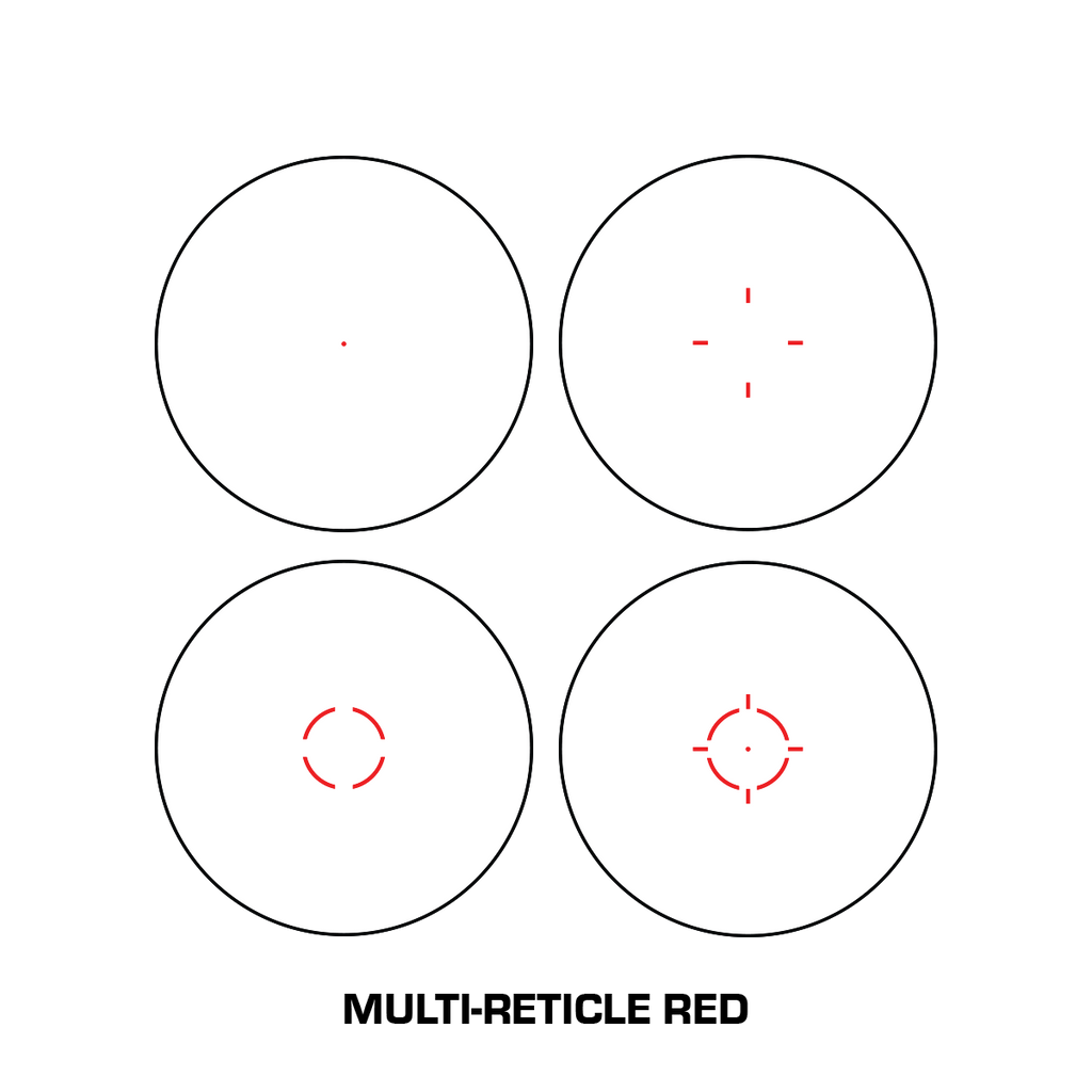 Liberator II Multi-Reticle provides 4 unique variants, including a single dot, open circle, crosshairs and a completed circle dot. Cycle between reticle variants effortlessly by holding the up illumination button for 3 seconds at a time. The versatility of the Multi-Reticle allows for reliable performance across various firearm platforms and calibers.