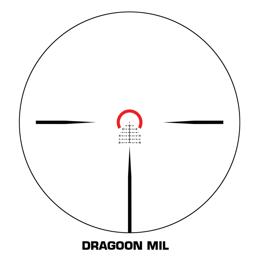 The Dragoon reticle is designed to be fast at 1x and highly precise at 6x. With the horseshoe and center dot illuminated, you can quickly acquire your target at low magnification. At 6x, the MIL tree gives you precise holdover points for longer-range shots.