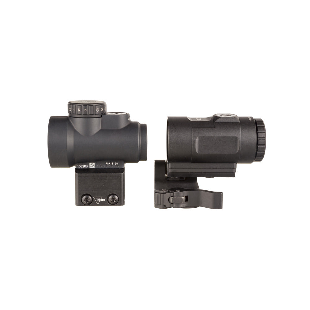 The Trijicon Miniature Rifle Optic (MRO®) HD Magnifier is a 3 power reflex optic magnifier specifically designed to magnify the target and target seen through the MRO HD red dot optic. By magnifying the target the shooter is able to use the crisp dot in the MRO HD to quickly and accurately engage targets at extended distances. The MRO HD Magnifier is short and compact which saves weight and rail space. The design features easy-to-set flush, toolless adjusters that make centering the reticle in the field of view easy. The adjustable diopter allows the user to tune the optical performance to their eyes.