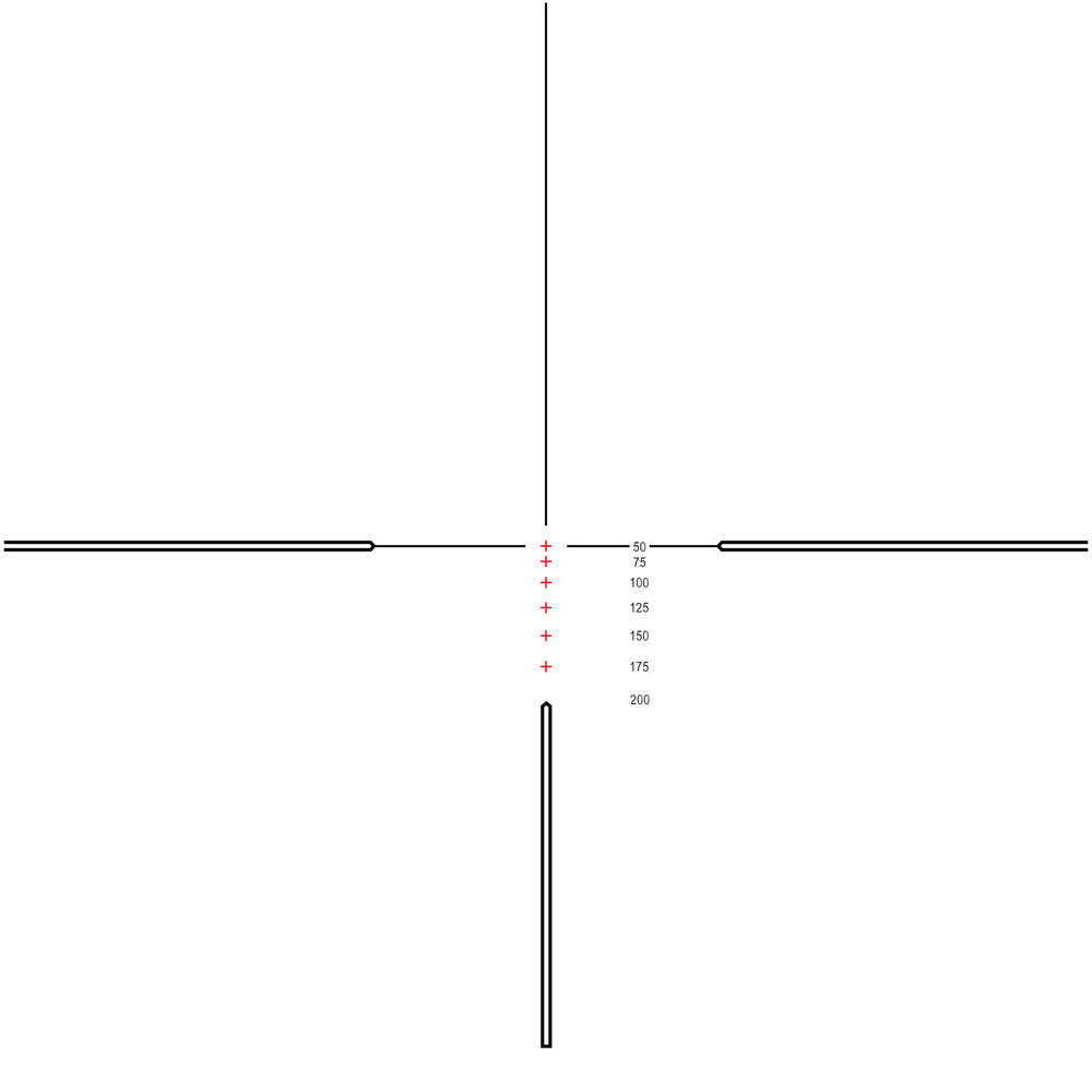 Designed for .22 LR High Velocity. Zero on 9x magnification at 50 yards and the bullet drop compensating reticle provides accurate aim points in 25 yard increments out to 200 yards. Ideal for .22 LR ammunition between 36-40gr and approx. 1235-1260 fps (376-384 m/s). Can also be accurately calibrated for standard velocity and sub-sonic ammunition.