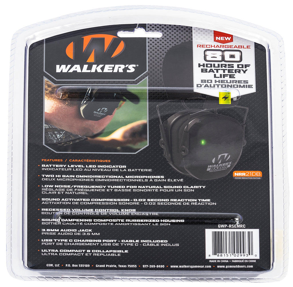 Walker's GWPRSEMRC Razor Rechargeable Electronic Muff Polymer 21 dB Over the Head Black Adult
