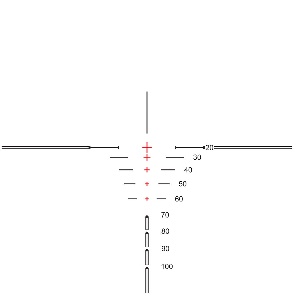 10yd aim points from a 20yd zero out to 100yds. Bracketing of 4 or 8 inches and aim marks measuring 1.5 inches across at the corresponding distances. Speeds from 250 to 425 fps.